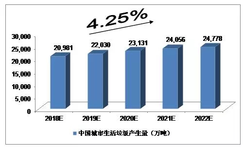 2015年,246個(gè)大、中城市生活垃圾產(chǎn)生量為18,564.0萬(wàn)噸;2016年,我國(guó)214個(gè)大、中城市生活垃圾產(chǎn)生量18,850.5萬(wàn)噸。我們預(yù)計(jì),2018年中國(guó)城市生活垃圾產(chǎn)生量將達(dá)到20,981萬(wàn)噸,未來(lái)五年(2018-2022)行業(yè)年均復(fù)合增長(zhǎng)率約為4.25%,2022年達(dá)到24,778萬(wàn)噸。