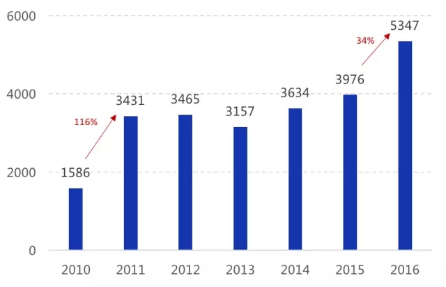資質(zhì)企業(yè)平均規(guī)模較?。?016年我國持危險廢棄物經(jīng)營許可證的企業(yè)數(shù)量為2149家,2016年凈增加僅115家,體現(xiàn)出環(huán)保系統(tǒng)對新頒發(fā)許可證愈發(fā)謹(jǐn)慎;平均每家處理量僅不到3萬噸,呈現(xiàn)較強(qiáng)的分散性特征,但單企業(yè)處理規(guī)模由2014年2.2萬噸/年增加到2016年3.0萬噸/年,未來隨著許可證頒發(fā)與復(fù)核難度加大,實力弱、技術(shù)差的小企業(yè)將被淘汰出市場,龍頭擴(kuò)張,單企業(yè)規(guī)模繼續(xù)擴(kuò)大。