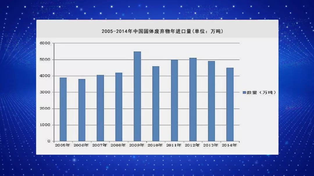 中國又是全球固體廢棄物進(jìn)口最大的國家。我們可以看一下,這個(gè)圖表是從2005年到2014年十幾年中國的固體廢棄物年進(jìn)口量。大家一看就很清楚,最近十多年,我們國家每年的固體廢棄物的進(jìn)口量都在5000萬噸。這樣的一個(gè)規(guī)模,是全球最大的固體廢棄物的進(jìn)口國,并且從中美貿(mào)易來看也是很有意思,就是在中美貿(mào)易里面有7%左右的貿(mào)易額,實(shí)際上是固體廢棄物的進(jìn)出口。