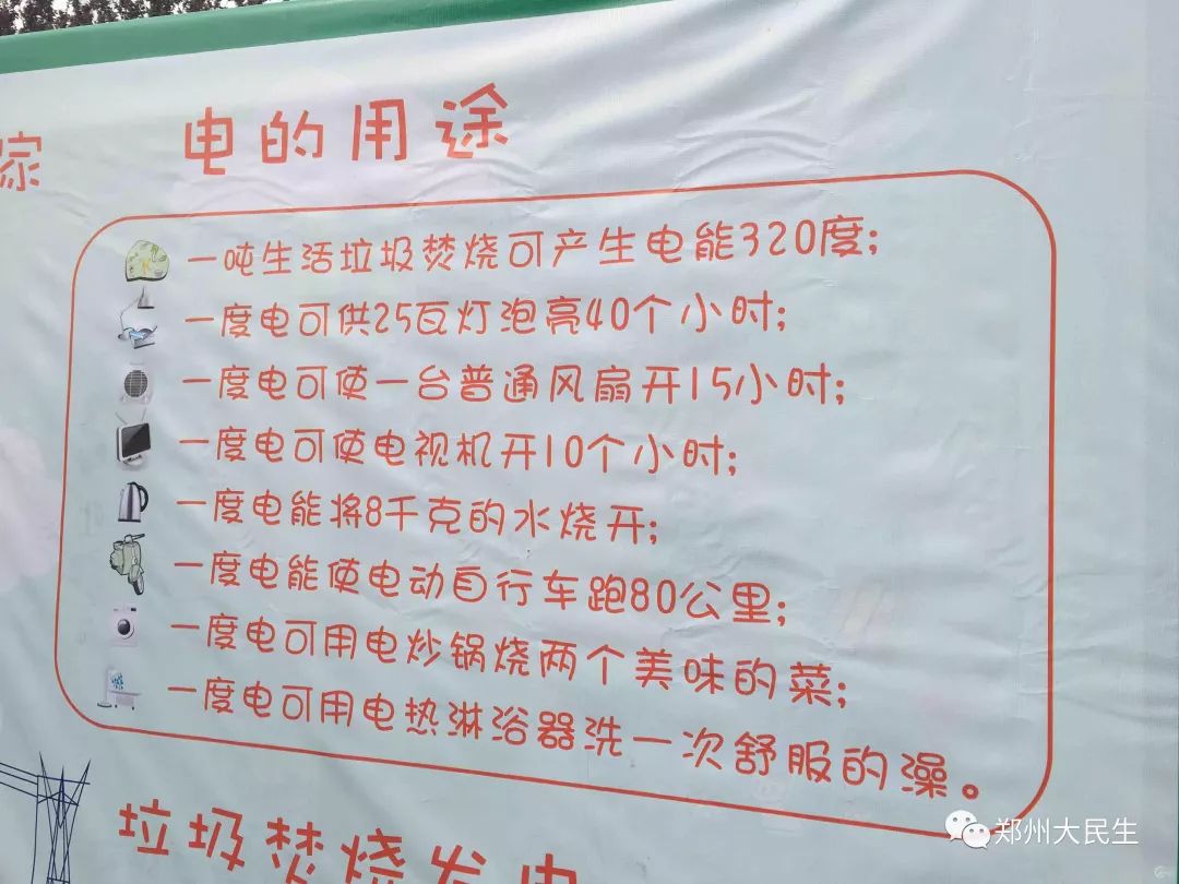一噸生活垃圾焚燒可產(chǎn)生電能320度;一度電可供25瓦燈泡亮40個小時;一度電可使一臺普通風(fēng)扇開15小時;一度電能使電動自行車跑80公里;一度電可使電視機(jī)開10小時。