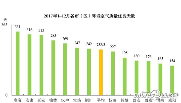 13個(gè)市(區(qū))優(yōu)良天數(shù)為154~331天,平均為238.5天,最多的是商洛331天,最少的是咸陽(yáng)154天。2017年,西安共收獲優(yōu)良天180天,與2016年相比減少了12天。
