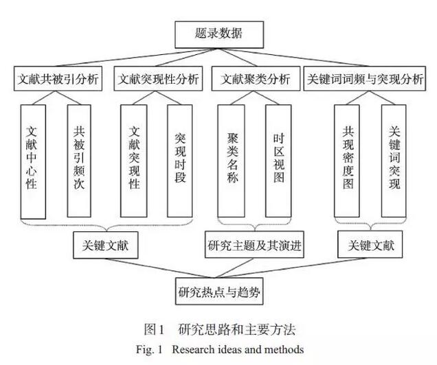 通過文獻(xiàn)共被引發(fā)現(xiàn)關(guān)鍵文獻(xiàn),進(jìn)一步通過文獻(xiàn)聚類分析,解讀土壤質(zhì)量研究主題的演進(jìn)規(guī)律及其驅(qū)動(dòng)因素;結(jié)合文獻(xiàn)突現(xiàn)分析、關(guān)鍵詞突現(xiàn)分析展現(xiàn)研究熱點(diǎn)的變遷,并發(fā)現(xiàn)未來的研究趨勢(shì)(圖 1)。在本研究中,Citespace V參數(shù)設(shè)置具體如下:時(shí)間段為1992—2016 年,以1 a 為時(shí)間切片,節(jié)點(diǎn)類型分別選擇被引文獻(xiàn)和關(guān)鍵詞,文獻(xiàn)選取標(biāo)準(zhǔn)為每個(gè)時(shí)間切片內(nèi)被引量前50 的文章,選擇尋徑剪枝方式。