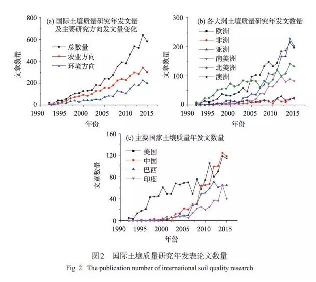 進(jìn)入20 世紀(jì)90 年代以來,國際上對(duì)土壤質(zhì)量的研究熱度不斷升高,相關(guān)文獻(xiàn)呈井噴式出現(xiàn)。國際土壤質(zhì)量研究年發(fā)文總量在1992—2008 年左右呈緩慢上升狀態(tài),2008 年之后呈現(xiàn)快速發(fā)展?fàn)顟B(tài)[圖2(a)],而土壤質(zhì)量研究的兩個(gè)主要方向(WOS給出) 農(nóng)業(yè)方向和環(huán)境方向的關(guān)注度也在不斷升溫,土壤質(zhì)量研究相對(duì)更偏向農(nóng)業(yè)方向。非洲和澳洲的土壤質(zhì)量研究相對(duì)較少,北美則起步較早[圖2(b)],在20 世紀(jì)90 年代初開展了較多關(guān)于土壤質(zhì)量方面的研究,2005 年之后,歐洲對(duì)土壤質(zhì)量的關(guān)注度迅速升溫,這是由于歐洲面臨嚴(yán)重的土壤退化問題,北美地區(qū)則發(fā)展速度放緩。亞洲和南美洲在該領(lǐng)域的研究起步較晚,2008 年之后發(fā)展速度加快,其中以亞洲最為突出。中國、印度、巴西作為發(fā)展中國家在土壤質(zhì)量方面研究起步晚,但后期發(fā)展加快;美國起步較早,前期開展了大量研究,后期速度變緩;中國在土壤質(zhì)量研究領(lǐng)域異軍突起,近幾年發(fā)文數(shù)量已超越美國[圖2(c)]。