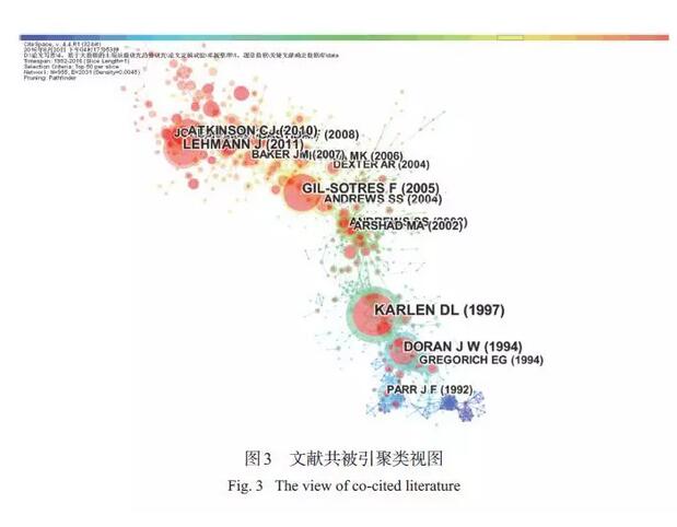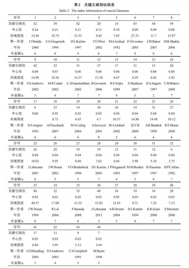 經(jīng)典文獻(xiàn)都密切關(guān)注了文獻(xiàn)發(fā)表時(shí)期該領(lǐng)域發(fā)展的熱點(diǎn)問題,因其較高的社會(huì)關(guān)注度、創(chuàng)新性和系統(tǒng)性,從而引發(fā)其他學(xué)者大量引用。通過對(duì)44 篇經(jīng)典文獻(xiàn)內(nèi)容的分析,2000 年以前多關(guān)注農(nóng)業(yè)管理措施對(duì)有機(jī)質(zhì)的影響和土壤質(zhì)量的概念,2000 年以后,對(duì)土壤質(zhì)量評(píng)價(jià)方法、評(píng)價(jià)指標(biāo)尤其是生物學(xué)指標(biāo)的研究不斷興起,更多地注重土壤質(zhì)量在農(nóng)業(yè)和環(huán)境方面的應(yīng)用,2008 年以來,關(guān)于土壤質(zhì)量與全球氣候變化、土壤修復(fù)的關(guān)系研究受到更多學(xué)者關(guān)注。從整個(gè)過程來看,土壤質(zhì)量從概念的產(chǎn)生到廣泛的應(yīng)用,一直圍繞農(nóng)業(yè)與環(huán)境的可持續(xù)發(fā)展,這也是人類可持續(xù)發(fā)展的主題之一。