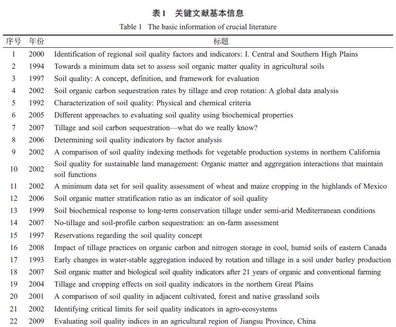 進(jìn)入20 世紀(jì)90 年代以來,國際上關(guān)于土壤質(zhì)量研究的文獻(xiàn)大量涌現(xiàn),涉及的學(xué)科和內(nèi)容非常廣泛。目前針對(duì)土壤質(zhì)量相關(guān)文獻(xiàn)的綜述已有不少,其中國外學(xué)者就土壤質(zhì)量概念與應(yīng)用、評(píng)價(jià)指標(biāo)、耕作、種植制度、作物殘茬管理對(duì)土壤質(zhì)量的影響等方面展開評(píng)述;國內(nèi)對(duì)土壤質(zhì)量研究綜述多集中在土壤質(zhì)量評(píng)價(jià)方法、指標(biāo)、標(biāo)準(zhǔn)以及可持續(xù)土地管理方面。這些研究綜述的發(fā)表對(duì)國內(nèi)外學(xué)者了解以及推動(dòng)土壤質(zhì)量研究發(fā)揮了重要作用。但是面對(duì)成千上萬的龐大文獻(xiàn)群,以文獻(xiàn)閱讀、總結(jié)歸納、定性探討為主要方法的傳統(tǒng)文獻(xiàn)綜述存在明顯的局限性,如Karlen 等、Sparrow 等、Sithole 等僅就土壤質(zhì)量的某個(gè)方面進(jìn)行了文獻(xiàn)綜述,其參考價(jià)值的高低也取決于研究者本身的研究水平,無法客觀、全面地反映該領(lǐng)域的發(fā)展脈絡(luò)以及研究趨勢(shì)。因此,還需要采用更為科學(xué)的方法對(duì)以上問題做進(jìn)一步的分析和探討。