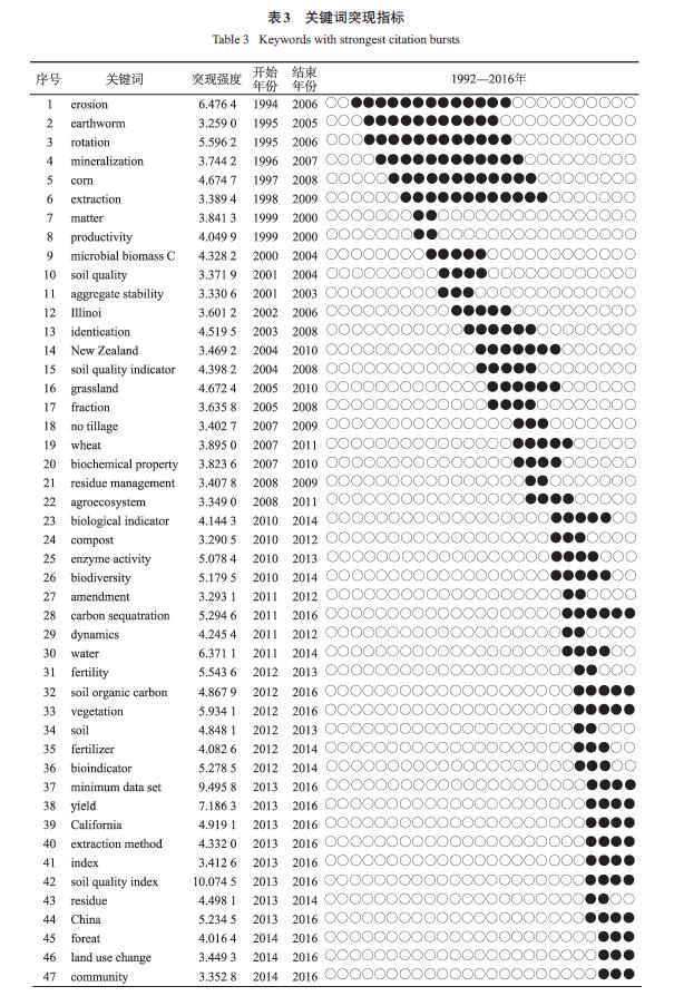 突現(xiàn)性反映了文獻(xiàn)在一定時(shí)期被引頻次的增長情況,突現(xiàn)性越大,說明被引頻次增長越快。44 篇文獻(xiàn)中有3 篇文獻(xiàn)的突現(xiàn)性顯著高于其他文獻(xiàn)。Doran 等(突現(xiàn)性40.57) 第一次將土壤質(zhì)量比較系統(tǒng)地展現(xiàn)在人們眼前,并分別就其概念、評(píng)價(jià)框架、應(yīng)用以及生物重要性進(jìn)行了系統(tǒng)的論述,這在土壤質(zhì)量概念還不被廣泛接受的時(shí)期極大地推動(dòng)了該領(lǐng)域的發(fā)展。而Karlen 等又在此基礎(chǔ)上將土壤質(zhì)量進(jìn)行了完善;Gil-sotres 等詳細(xì)論述了土壤質(zhì)量生物指標(biāo)的選取以及所面臨的問題,為未來利用土壤生物指標(biāo)評(píng)價(jià)土壤質(zhì)量提出了發(fā)展方向。