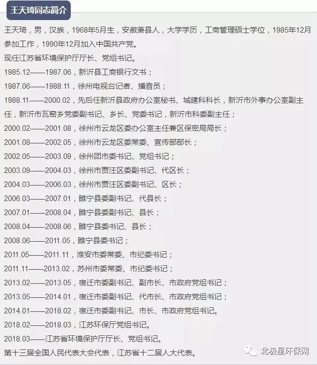 3月28日,江蘇省第十三屆人民代表大會(huì)常務(wù)委員會(huì)第二次會(huì)議通過,王天琦為江蘇省環(huán)境保護(hù)廳廳長。