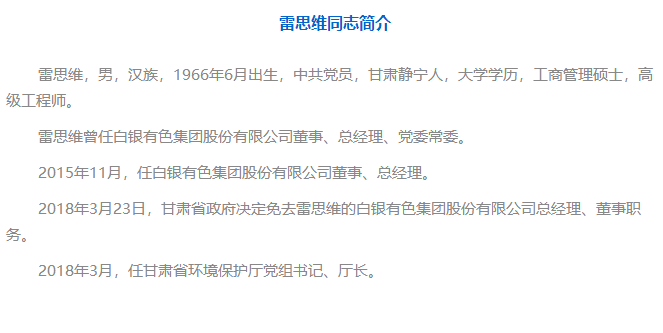 3月28日,甘肅省十三屆人大常委會(huì)第二次會(huì)議通過了省人民代表大會(huì)常務(wù)委員會(huì)決定任免名單,決定任命雷思維為甘肅省環(huán)境保護(hù)廳廳長。