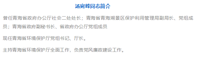 3月30日,青海省第十三屆人民代表大會(huì)常務(wù)委員會(huì)第二次會(huì)議通過,決定任命:湯宛峰為青海省環(huán)境保護(hù)廳廳長。