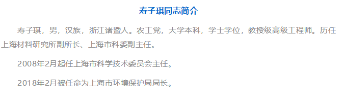 而上海市環(huán)保局局長壽子琪,則是典型的專家型官員,他是教授級高級工程師,歷任上海材料研究所副所長、上海市科學(xué)技術(shù)委員會(huì)副主任、上海市科學(xué)技術(shù)委員會(huì)主任。