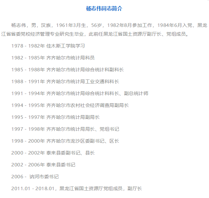 1月30日,黑龍江省第十三屆人民代表大會(huì)常務(wù)委員會(huì)第一次會(huì)議決定任命楊志偉為省環(huán)境保護(hù)廳廳長。