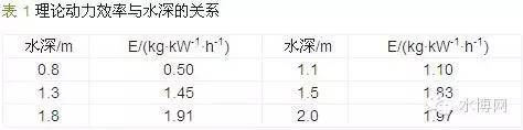 因此,曝氣器安裝越深越有利于充氧能力和氧利用率的提高。但安裝水深增加的同時(shí)阻力損失也會(huì)增加,為了克服阻力損失,就必須增加曝氣量,這勢(shì)必會(huì)導(dǎo)致能耗和運(yùn)行成本的增加。因此,為了得到最佳安裝水深,有必要對(duì)理論動(dòng)力效率與水深的關(guān)系進(jìn)行評(píng)估,見表1。