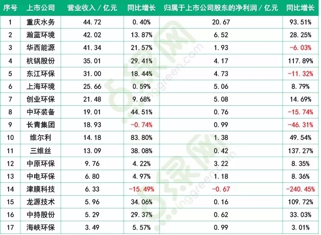 截止4月3日止共有17家環(huán)保上市公司發(fā)布2017年年報(bào)(其余將繼續(xù)跟進(jìn))。2017年?duì)I收排名靠前重慶水務(wù)、瀚藍(lán)環(huán)境、華西能源均在40億以上,營(yíng)收僅津膜科技和長(zhǎng)青集團(tuán)同比下降。