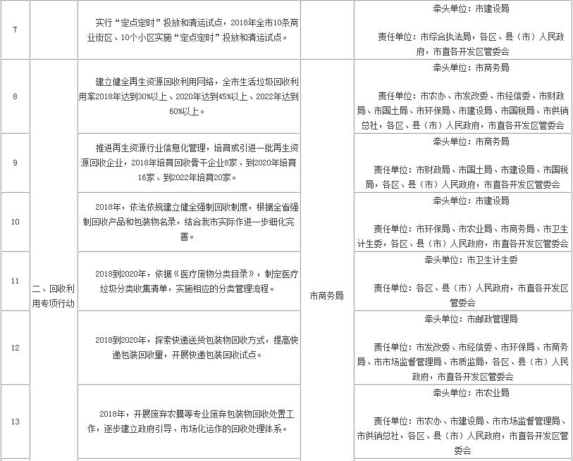 (一)一年細分目標。2018年,全市生活垃圾增長率控制在2.5%以下;市區(qū)城區(qū)、縣(市)城區(qū)和農(nóng)村分類覆蓋面分別達到80%、60%和75%;全市黨政機關和企事業(yè)單位實施強制分類覆蓋面達到100%,全市城區(qū)社會組織、公共場所和相關企業(yè)實施強制分類覆蓋面達到80%;新增生活垃圾焚燒穩(wěn)定運行處置能力2250噸/日、餐廚垃圾處置能力500噸/日;新增省級高標準生活垃圾分類示范小區(qū)、示范村各25個;初步建立全市再生資源回收利用網(wǎng)絡,其中培育回收骨干企業(yè)8家;完成城區(qū)范圍內(nèi)不符合規(guī)范要求的生活垃圾清運車輛和中轉(zhuǎn)站整治改造;市、縣兩級初步建立生活垃圾分類處理智能化大數(shù)據(jù)平臺;城鄉(xiāng)生活垃圾分類投放正確率穩(wěn)步提升,回收利用率、資源化利用率、無害化處理率分別達到30%以上、80%以上、100%。