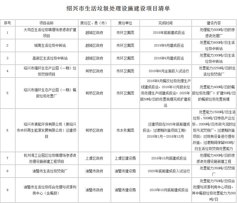 2.紹興市生活垃圾處理設施建設項目清單
