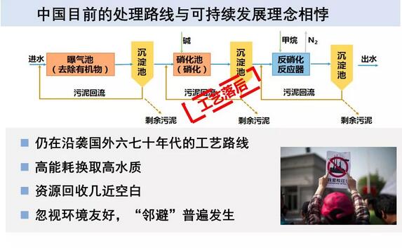 這條路線將污水視為污染物,以大占地、長流程、高能耗、高物耗的代價,去獲取有限指標(biāo)的達(dá)標(biāo)排放,同時產(chǎn)生大量污泥、噪聲、臭氣,在城市生活中已成為令人嫌棄的存在。