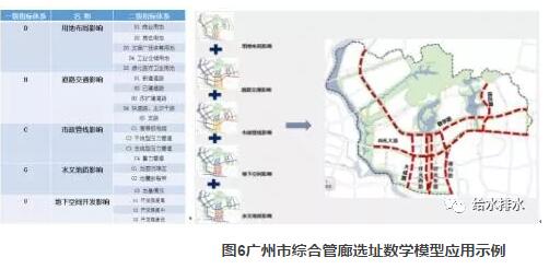 在綜合管廊中觀布局規(guī)劃層面,規(guī)劃運(yùn)用綜合管廊選址評估模型。評估模型將包含綜合用地、道路交通、市政管線、水文地質(zhì)、地下空間等5類一級指標(biāo)、20個(gè)二級指標(biāo)綜合考慮,建立數(shù)學(xué)評估模型,進(jìn)行片區(qū)綜合管廊布局。廣州市綜合管廊選址數(shù)字模型應(yīng)用示例見圖6。