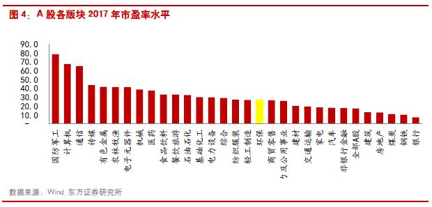 從估值水平來看,以2018年4月27日收盤價作為測算標準,全部A股2017年業(yè)績對應的PE水平為17.3倍,環(huán)保板塊PE為26.9倍,處于所有板塊的平均水平。結合環(huán)保板塊的業(yè)績高增長趨勢,我們認為環(huán)保板塊的估值屬于比較合理的水平。
