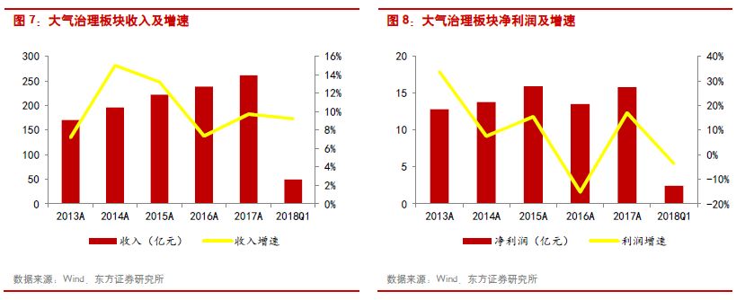 分各個細分板塊看,水環(huán)境治理、監(jiān)測、再生資源等實現(xiàn)了較高的業(yè)績增速,行業(yè)景氣度較高,而傳統(tǒng)的大氣治理、節(jié)能板塊增速較低。同時,公司的兩極分化也日益明顯,競爭力較強的板塊龍頭,尤其是所處行業(yè)景氣度較高的龍頭企業(yè),收入和利潤增速顯著高于行業(yè)平均水平。