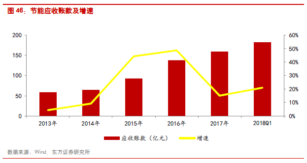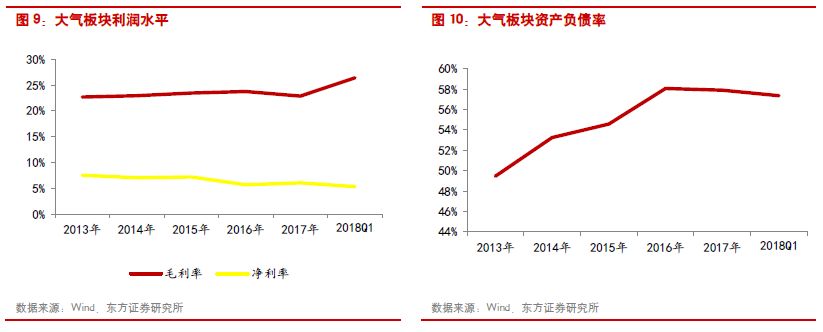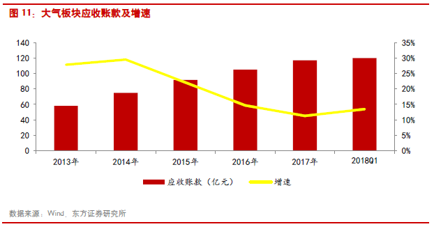 大氣治理板塊2017年收入和歸母凈利潤分別同比增長9.73%和16.95%;2018年Q1收入增速9.24%,凈利潤增速-3.65%。行業(yè)整體的利潤體量較2016年有所好轉主要是由于科融環(huán)境和龍源技術業(yè)績扭虧為盈所致(科融環(huán)境和龍源技術2016年凈利潤分別為-1.32和1.64億元),但合計利潤體量占到大氣治理板塊近9成的龍凈環(huán)保和清新環(huán)境的利潤增速卻相對有限,低于其他板塊的龍頭公司,其中龍凈環(huán)保的利潤增速為9.10%,而清新環(huán)境則同比下滑12.44%。大氣治理板塊由于費用率增加,凈利率已降至5.33%。行業(yè)資產負債率也基本保持在57%左右。應收賬款方面,由于大部分大氣治理項目開始進入運營階段,所以行業(yè)整體應收賬款增速開始放緩,2017年增速約為11%。
