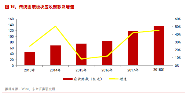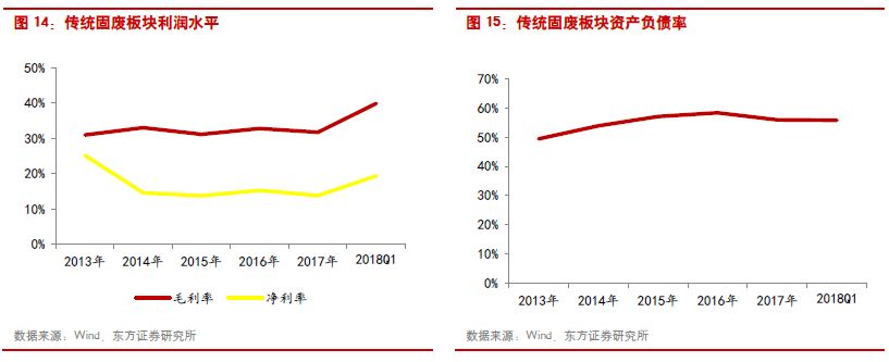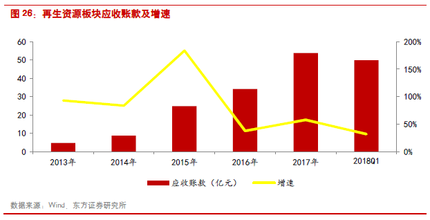 傳統(tǒng)固廢:由于盛運環(huán)保2017年出現(xiàn)重大的業(yè)績變化(2016年歸母凈利潤為1.19億,2017年虧損13.18億),在統(tǒng)計傳統(tǒng)固廢處置板塊時剔除了盛運環(huán)保的影響。因此傳統(tǒng)固廢處置板塊2017年的收入和利潤增速分別為27.95%和15.53%。收入增速為最近三年最高,主要得益于環(huán)衛(wèi)、危廢等業(yè)務的收入占比的提升,而凈利潤增速低于營業(yè)收入的增速主要是因為環(huán)衛(wèi)業(yè)務增長的初期,項目的毛利率相對有限。從利潤水平看,傳統(tǒng)固廢的毛利率基本保持在30%左右,但由于運營、銷售和財務費用的增加,導致行業(yè)的凈利率水平呈現(xiàn)下滑趨勢,2017年凈利率為13.78%。行業(yè)資產負債率基本保持55%左右。應收賬款方面,由于每年仍有垃圾焚燒工程以BOT模式進入開工建設期,所以行業(yè)的應收賬款增速上升,2017年增速達到42.13%。