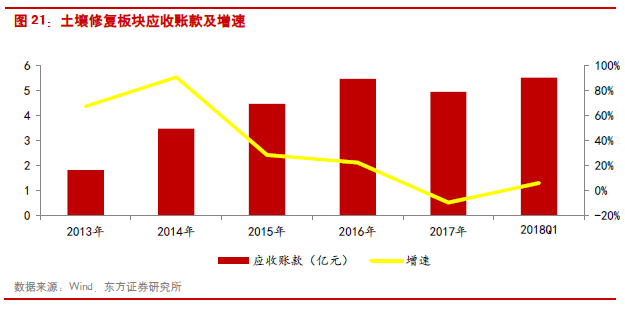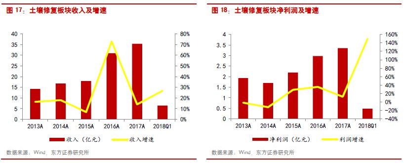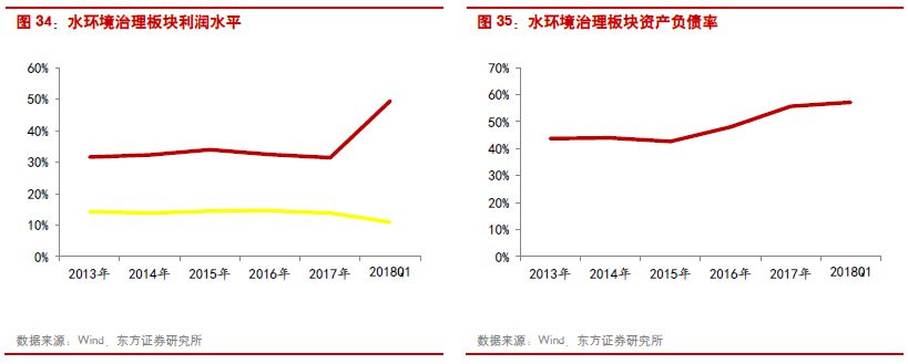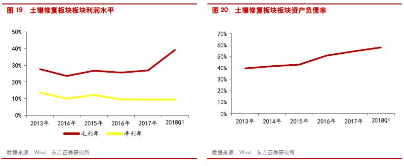 土壤修復:由于全國土壤污染普查尚未結束,且“十三五”前中期的環(huán)保治理重點在煙氣治理和水環(huán)境綜合治理,因此2017年土壤修復行業(yè)新增訂單較少,土壤修復板塊2017年的收入和利潤增速分別為13.98%和12.57%,明顯低于2016年同期水平。由于拓展了PPP的業(yè)務,行業(yè)資產負債率呈現(xiàn)上升趨勢,2017年資產負債率為57.94%,比上一年同期增加了近3個百分點。