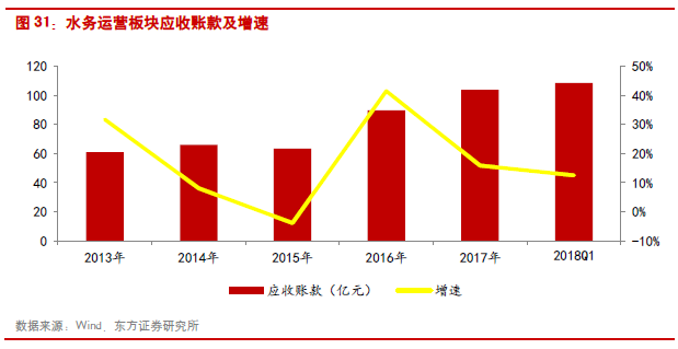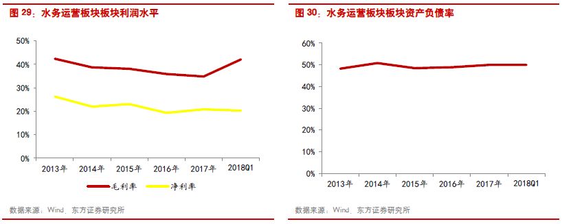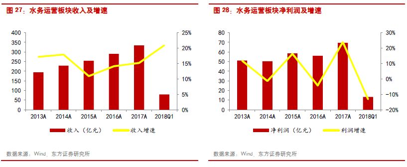 傳統(tǒng)水務運營:傳統(tǒng)水務2017年和2018Q1實現(xiàn)收入增速分別為15.19%和20.89%,歸母凈利潤同比增長23.92%和-13.14%。由于受到增值稅政策調整的影響,傳統(tǒng)水務板塊2016年業(yè)績?yōu)樨撛鲩L,但2017年以后增值稅對于行業(yè)的影響基本消除,行業(yè)回到20%左右的利潤增速水平。個股方面,重慶水務由于污水處理業(yè)務增值稅及附加稅費、污水處理業(yè)務增值稅即征即退、收到實際承擔污水增值稅及附加稅費的補助等事項影響,歸母凈利潤同比增長93.51%至20.67億元。