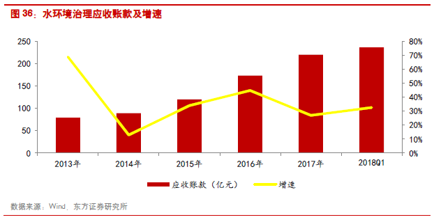 水環(huán)境治理:水環(huán)境治理是環(huán)保中涉及PPP影響最大的細分領域,2017年在PPP項目管理庫持續(xù)擴容的大背景下,水環(huán)境治理相關的上市公司實現(xiàn)了訂單大幅增長,并有效地轉化成了公司的收入。同時2017年下半年以來財政部限制地方債務和規(guī)范PPP的相關政策法規(guī)對環(huán)保類PPP項目的影響相對有限,因此2018Q1延續(xù)了行業(yè)的高景氣度。水環(huán)境治理板塊2017年收入增速48.03%,歸母凈利潤增速40.54%;2018年Q1收入增速61.92%,歸母凈利潤增速0.13%。板塊的利潤水平基本保持穩(wěn)定,毛利率30%左右,受財務費用增長影響,凈利率降至13.84%。由于水環(huán)境治理類PPP項目對企業(yè)的資金能力要求較高,行業(yè)融資需求加大,2017年板塊的資產負債率由上一年的48.06%增長到55.69%。2017年應收賬款增速為26.99%,略高于其他環(huán)保板塊。