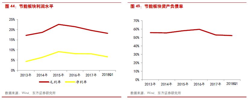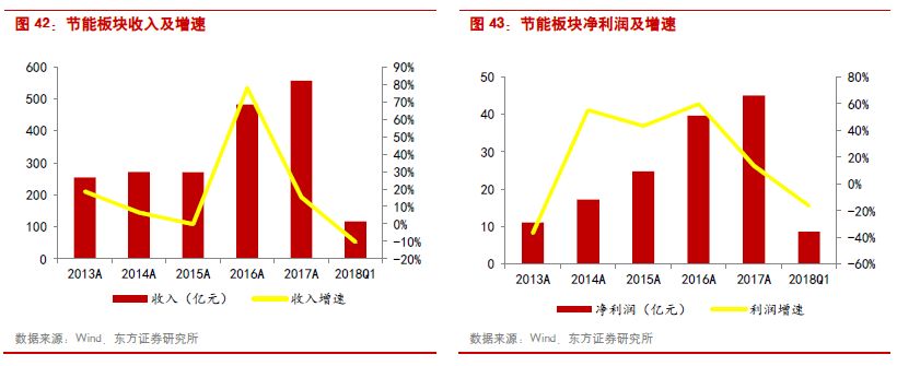 節(jié)能版塊2017年收入和歸母凈利潤增速分別為15.35%和13.61%;2018Q1收入和歸母凈利潤分別下滑10.32%和16.31%。板塊的利潤水平呈下降趨勢,2015年、2016年、2017年毛利率分別為22.52%、21.38%、19.55%;凈利潤分別為9.16%、8.22%、8.10%。由于節(jié)能項目普遍投資體量較大,板塊的資產負債率基本維持在58%-60%,屬于環(huán)保細分領域中較高的水平。受神霧環(huán)保和神霧節(jié)能業(yè)績下滑影響,2018Q1節(jié)能版塊整體收入和利潤大幅下滑。