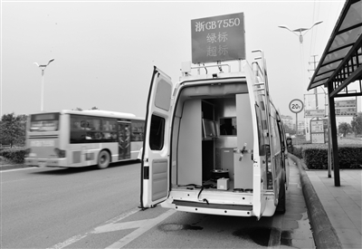 金華市機(jī)動(dòng)車尾氣遙感監(jiān)測(cè)車正在相關(guān)路段開展檢測(cè)執(zhí)法。