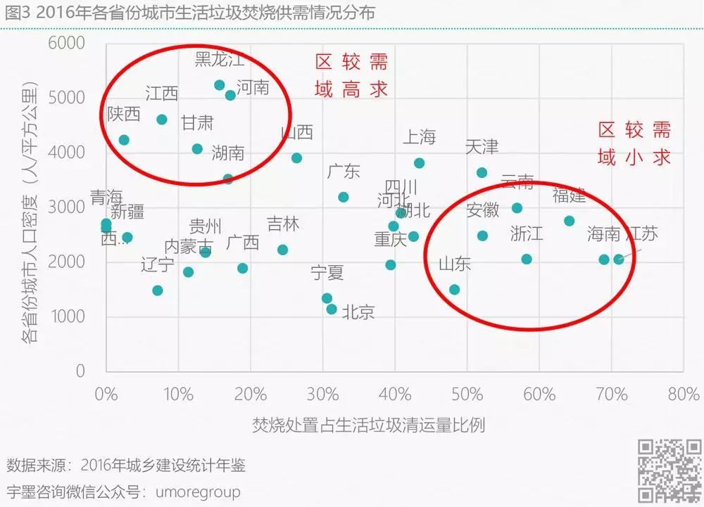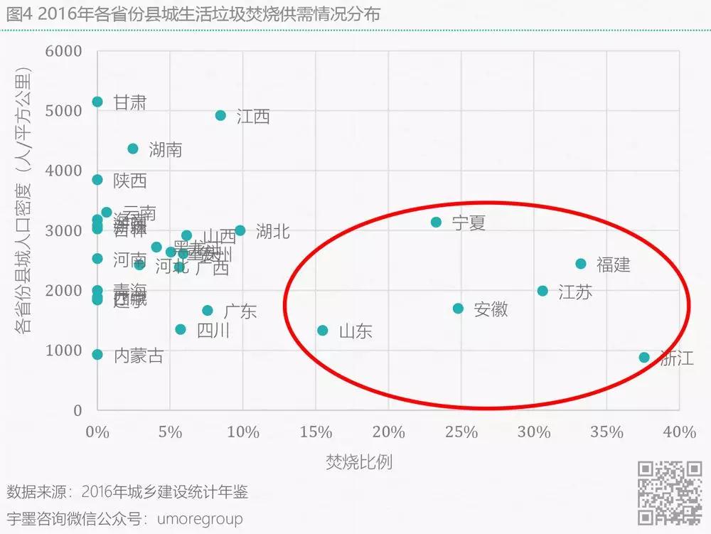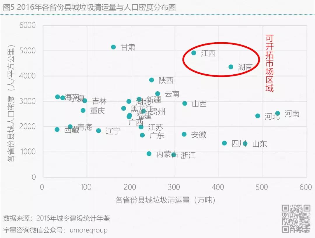 接下來從各省份縣域維度分析,從城建部的數(shù)據(jù)來看全國各個省份的生活垃圾無害化處置率基本都維持在70%以上,但是除了上海、江蘇、浙江、安徽、山東、寧夏這六個省市區(qū)外,其余地區(qū)焚燒處置垃圾比率均不足10%(圖4),而甘肅、江西、湖南三個省份縣城人口密度最高,焚燒比率缺口相對較大。另一方面,一個地區(qū)的垃圾清運(yùn)量理應(yīng)與地區(qū)的人口密度成正比,但是由于中國縣級以下地區(qū)人口遷移度大,戶籍人口密度與常住人口密度出入存在一定差異,因此從圖6可看在甘肅地區(qū)垃圾清運(yùn)較低但人口密度偏高的地區(qū),人口外流比例會相對較高,當(dāng)然這里也不排除各地市人均垃圾產(chǎn)生量有較大差異。宇墨通過對各省份縣城垃圾清運(yùn)量與各省份縣城人口密度分布的分析(圖5),推斷在人口密度相對高且垃圾產(chǎn)生量相對較多的江西和湖南兩省份的縣城區(qū)域開辟垃圾焚燒發(fā)電市場相對較容易,而在這些省份縣城中那些旅游景區(qū)及高校等區(qū)域或有更多的垃圾供給。畢竟對于縣級鄉(xiāng)級地市建設(shè)垃圾焚燒發(fā)電廠有一大難題,當(dāng)焚燒廠建好后,由于垃圾產(chǎn)生量不足而造成的垃圾發(fā)電廠無法長期運(yùn)營的情況對企業(yè)來說乃是硬傷,且在《“十三五”全國城鎮(zhèn)生活垃圾無害化處理設(shè)施建設(shè)規(guī)劃》中已提出不鼓勵建設(shè)處理規(guī)模小于300噸/日的焚燒設(shè)施。對于想要進(jìn)軍縣級區(qū)域開辟市場的企業(yè)來說,如何有效收集垃圾以及降低收運(yùn)成本使得焚燒廠實現(xiàn)滿負(fù)荷工作將是主要考慮因素。