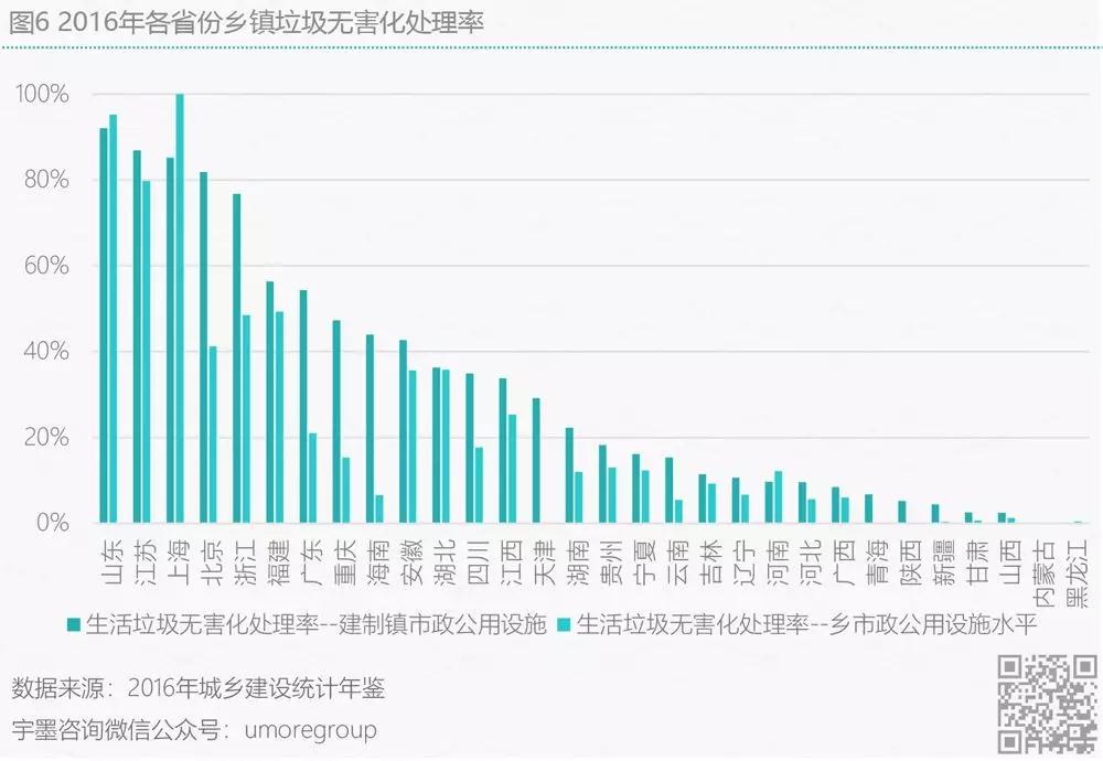 最后,從鄉(xiāng)鎮(zhèn)維度分析,各地區(qū)基本沒有垃圾焚燒發(fā)電的處置方式,而垃圾填埋則為垃圾無害化處置中占比最高的方式,依據(jù)數(shù)據(jù)來看,各省份鄉(xiāng)鎮(zhèn)垃圾的無害化處置占比各地比率存在較大差異,浮動區(qū)間在10-100%之間。中國城市建設(shè)研究院總工程師徐海云指出,農(nóng)村地區(qū)在現(xiàn)有生活垃圾填埋場選址上建設(shè)垃圾焚燒發(fā)電廠將是優(yōu)先選擇,且由于我國各地鄉(xiāng)鎮(zhèn)地區(qū)的人口流動性的差異以及不可控,此處將僅依據(jù)各省份的無害化處置比重來推測各省份鄉(xiāng)鎮(zhèn)垃圾焚燒發(fā)電市場機(jī)遇。如圖6所示,在山東、江蘇、上海、北京、浙江、福建、廣東、重慶、海南、安徽這些地方的鄉(xiāng)鎮(zhèn)地區(qū)有相對較大的垃圾焚燒發(fā)電市場缺口。