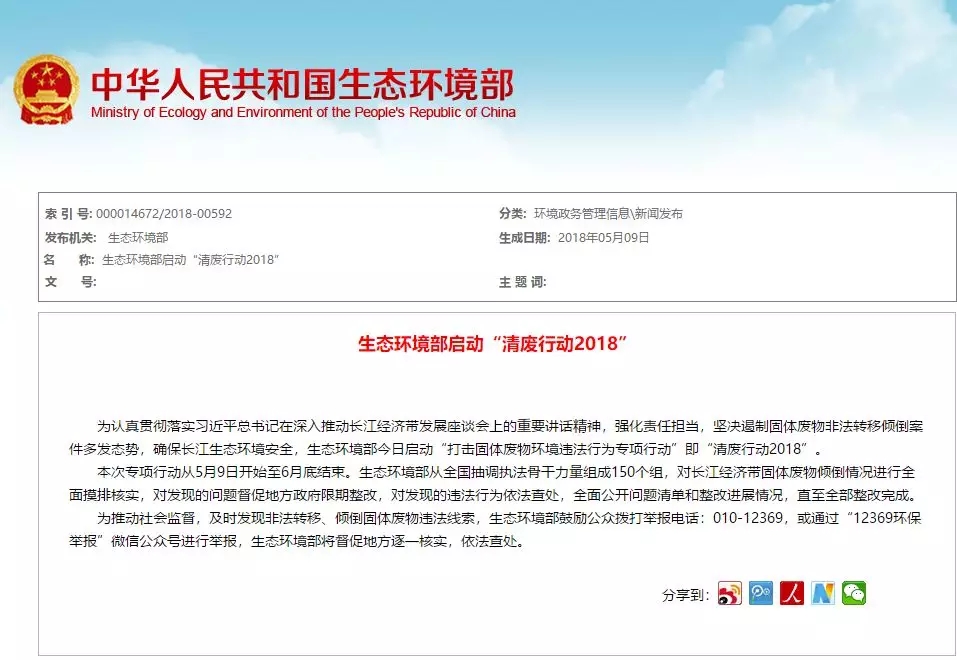 為遏制長江流域固體廢物非法轉(zhuǎn)移傾倒案件多發(fā)態(tài)勢,及時消除環(huán)境安全隱患,保障長江生態(tài)環(huán)境安全,生態(tài)環(huán)境部決定組織開展打擊固體廢物環(huán)境違法行為專項行動。從有關(guān)?。▍^(qū)、市)環(huán)保系統(tǒng)抽調(diào)人員,組成150個專項行動督查組,對長江經(jīng)濟(jì)帶11省(市)1400多個固體廢物堆存點位進(jìn)行現(xiàn)場核查督導(dǎo)。這場名為“清廢行動2018”的打擊固體廢物環(huán)境違法行為專項行動正式拉開序幕。
