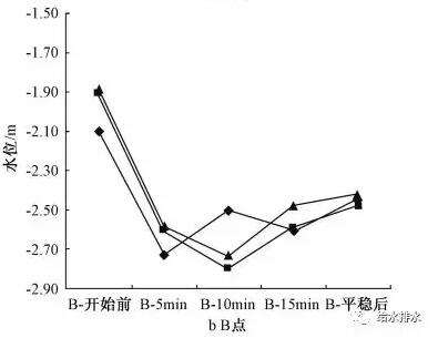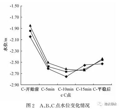 試驗(yàn)發(fā)現(xiàn),A、B、C、D2、E1等5個(gè)點(diǎn)的水位,會(huì)隨F調(diào)蓄池進(jìn)水至蓄滿而呈U型狀變化,以A、B、C為例(見圖2),基本都在10~15 min時(shí)水位變化最為明顯。但位于遠(yuǎn)端的D、E、D1等3個(gè)點(diǎn)幾乎未發(fā)生變化。由此可以初步判斷,F(xiàn)調(diào)蓄池對(duì)進(jìn)水總管的拉動(dòng),至C點(diǎn)結(jié)束,總長(zhǎng)約1 200 m;調(diào)蓄池的運(yùn)行,僅對(duì)鄰近的管網(wǎng)起到了收水效果。