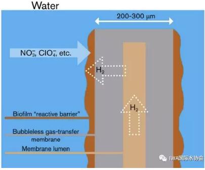 這里所說(shuō)的活性底物是一種氣體傳送膜,如下圖所示,它將氫氣以特定的壓力輸送到無(wú)孔中空纖維膜的內(nèi)腔,然后擴(kuò)散至MBfR反應(yīng)器中的生物膜,它能夠以100%效率將低溶解度氣體底物進(jìn)行擴(kuò)散,另一側(cè)的氧化態(tài)污染物從液態(tài)擴(kuò)散到生物膜中,電子供體和受體就在生物膜進(jìn)行反應(yīng)。