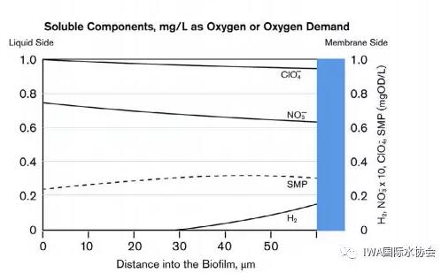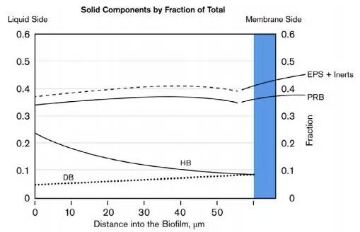 Rittmann教授表示氫氣的傳遞是由膜內(nèi)腔的氫氣壓控制,不能過(guò)量或不足,應(yīng)按照電子受體的負(fù)荷按需供應(yīng),它的工作曲線如下圖所示。同時(shí)Rittmann教授也用下圖說(shuō)明這些氧化態(tài)污染物往往是以混合物的形式出現(xiàn),例如硝酸鹽和高氯酸鹽。多受體的存在可能會(huì)形成復(fù)雜的微生物生態(tài),尤其當(dāng)需要不同的細(xì)菌來(lái)還原各種電子受體。大家可以看到反硝化菌(DB)生長(zhǎng)最快,而且在底層附近獲得最佳位置,而高氯酸還原菌(PRB)一般只能在反硝化層外,因?yàn)樗鼰o(wú)法跟反硝化菌競(jìng)爭(zhēng)氫氣。EPS則無(wú)處不在,占據(jù)了生物膜的中心。