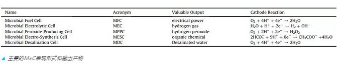 MxC是三個(gè)單詞的首字母縮寫(xiě),Rittmann教授在綜述中解釋了為什么他用其來(lái)稱呼微生物電化學(xué)電池。MxC包含了一套基于通用平臺(tái)的技術(shù)集合:其中C代表Cell,表示該系統(tǒng)是一個(gè)包含陽(yáng)極和陰極的電化學(xué)電池;M指微生物,而x表示這個(gè)平臺(tái)可以用不同的方式呈現(xiàn),對(duì)應(yīng)產(chǎn)生不同的產(chǎn)物,例如下表中的五種形式。另外MxC在其他文章的別稱可能包括生物電化學(xué)系統(tǒng)(BES),生物電化學(xué)技術(shù)(BET)和微生物電化學(xué)技術(shù)(MET)。