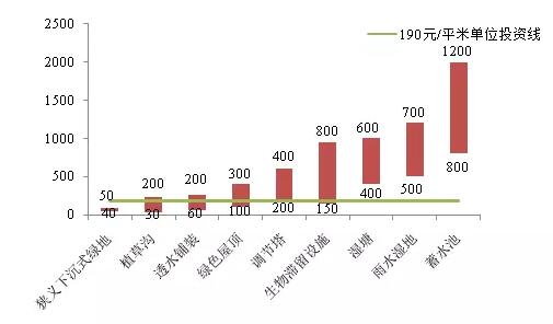 2015年10月9日在國(guó)務(wù)院例行政策吹風(fēng)會(huì)上,住建部已選擇16個(gè)城市開(kāi)展“海綿城市”建設(shè)試點(diǎn),計(jì)劃3年內(nèi)投資865億元,建設(shè)面積450多平方公里,按此計(jì)算,每平方公里投資約1.9億元(折合190元/平米),而實(shí)踐中大部分海綿城市相關(guān)的低影響開(kāi)發(fā)單項(xiàng)設(shè)施投資均在190元/平米之上(圖1)。