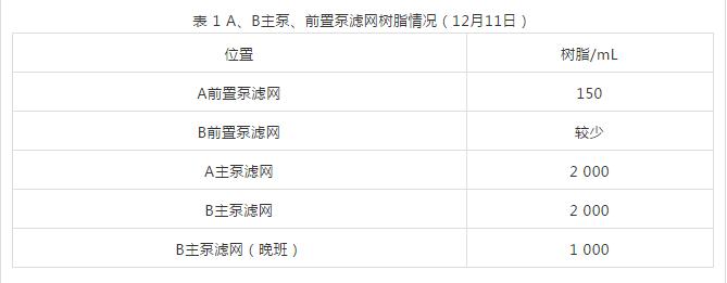 故障三:凝結(jié)水中有樹脂,過熱蒸汽電導(dǎo)率超標,給水泵主泵、前置泵濾網(wǎng)壓差大,檢查有樹脂。12月11日5:00檢修處理給水泵密封水進水濾網(wǎng)時發(fā)現(xiàn)網(wǎng)面內(nèi)有樹脂,樹脂顆粒完整,顆粒偏小。同時,化學(xué)儀表取到水樣后發(fā)現(xiàn)過熱蒸汽電導(dǎo)率高達1.4 μS/cm(剛升爐時,人工分析蒸汽二氧化硅合格),并在7:30最大至1.8 μS/cm。檢查發(fā)現(xiàn)給水泵主泵、前置泵濾網(wǎng)壓差大,A、B主泵、前置泵濾網(wǎng)樹脂情況見表 1。