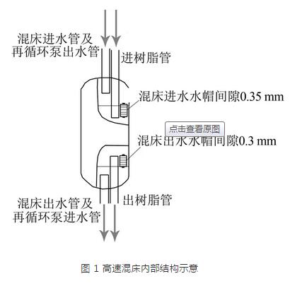 凝結(jié)水高速混床樹脂在上下隔板之間,通過隔板間的不銹鋼水帽隔離,進水通過水帽進入樹脂,通過樹脂層進行處理后,再通過下水帽出水(圖 1)。上水帽的間隙為0.35 mm,下水帽的間隙為0.3 mm,樹脂捕捉器濾元縫隙寬度0.20 mm。樹脂粒度范圍:陽樹脂0.63~0.81 mm,陰樹脂0.45~0.71 mm。根據(jù)對混床水帽和樹脂捕捉器的檢查情況,判斷樹脂不是在運行階段進入系統(tǒng),只有在此次機組啟動和上次機組停運階段漏入系統(tǒng)。樹脂從高速混床漏出只有兩個途徑:從上水帽漏出;從下水帽漏出。