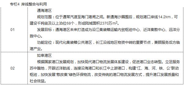 推進岸線整合與利用。提升開發(fā)利用區(qū)岸線使用效率,合理安排港口岸線、過江通道岸線、取排水口岸線??刂葡嚓P(guān)企業(yè)無序占用岸線,推進公共碼頭建設(shè)。港口工業(yè)生產(chǎn)岸線騰退轉(zhuǎn)移,生活、生態(tài)岸線空間穩(wěn)步增加,實現(xiàn)“三生”空間有序發(fā)展,統(tǒng)籌重要過江通道岸線的控制預(yù)留。加快沿江原南通港區(qū)、任港港區(qū)、狼山港區(qū)、富民港區(qū)以及江海港區(qū)的分期轉(zhuǎn)移和整合,形成沿江五港區(qū)的總體格局。嚴(yán)控新增港口岸線利用,取消或調(diào)整與水源保護、生態(tài)紅線區(qū)域等有沖突的港口碼頭。對一些開發(fā)布局不合理、未按國家有關(guān)規(guī)定、不符合規(guī)劃的開發(fā)利用項目逐步加以糾正。對涉及岸線利用的各類違法違規(guī)行為,重點清理整頓,逐步消除存量,堅決遏制增量。依法取締不具備安全生產(chǎn)條件、不符合環(huán)境保護要求的非法碼頭和裝卸點,到2020年,沿江非法碼頭徹底消除。建立健全長江岸線保護和開發(fā)利用協(xié)調(diào)機制,統(tǒng)籌岸線與后方土地的使用和管理。探索建立岸線資源有償使用制度。