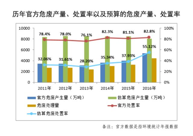 據(jù)第三方報(bào)告顯示,當(dāng)前,我國(guó)危廢實(shí)際產(chǎn)量遠(yuǎn)超官方統(tǒng)計(jì)。2011年至2016年,我國(guó)危廢年產(chǎn)量在8035至8551噸之間,每年約有4000至5000噸危廢游離于監(jiān)管之外,沒(méi)有經(jīng)過(guò)正規(guī)處置。以2016年數(shù)據(jù)來(lái)看,危廢產(chǎn)量同比增長(zhǎng)34.49%。同時(shí),危廢貯存量長(zhǎng)期處于較高水平,每年約有近五分之一的危廢被貯存。