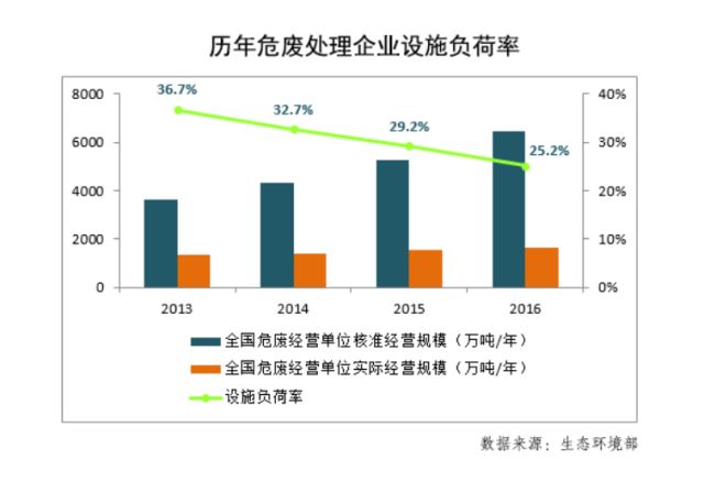 據(jù)生態(tài)環(huán)境部數(shù)據(jù)顯示,危廢處置企業(yè)的設(shè)施負(fù)荷率常年處于低水平運(yùn)行,且有逐年下降趨勢(shì)。處理資質(zhì)與市場(chǎng)需求錯(cuò)配,導(dǎo)致產(chǎn)能結(jié)構(gòu)化過(guò)剩。同時(shí),產(chǎn)能區(qū)域性布局不合理亦是造成危廢處置企業(yè)整體負(fù)荷率低的重要因素。