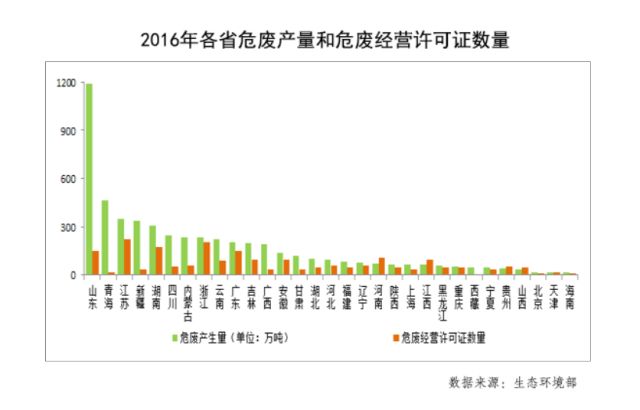 2016年,持證企業(yè)數(shù)量最多的省份是江蘇,有221家,占全國(guó)持證總數(shù)的10%。而危廢產(chǎn)量第二的青海省,持證企業(yè)僅有19家,且核準(zhǔn)的經(jīng)營(yíng)規(guī)模不到危廢產(chǎn)量的1/10,市場(chǎng)供給嚴(yán)重不足。
