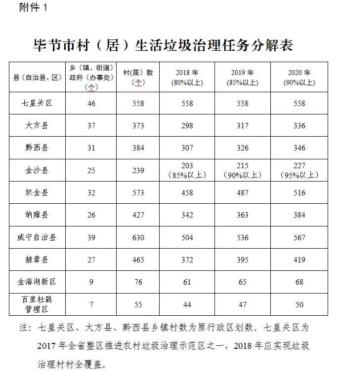 (二)全域治理(2019年),全面開展城鄉(xiāng)垃圾治理攻堅行動。組建城鄉(xiāng)垃圾分類收運保潔隊伍,逐步探索垃圾分類收集保潔制度,實現(xiàn)城鄉(xiāng)環(huán)衛(wèi)保潔全覆蓋。全面推進城鄉(xiāng)生活垃圾“戶分類、村收集、鄉(xiāng)轉(zhuǎn)運、縣(中心鄉(xiāng)鎮(zhèn))處理”或“戶分類、村收集、中心鄉(xiāng)鎮(zhèn)處理”模式,開展城鄉(xiāng)垃圾清潔風暴行動,全面清理城鄉(xiāng)垃圾。七星關區(qū)、金沙縣90%以上行政村垃圾得到有效治理,其他縣(自治縣、區(qū))85%以上行政村垃圾得到有效治理。
