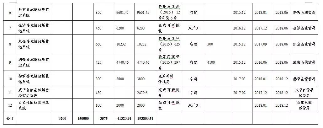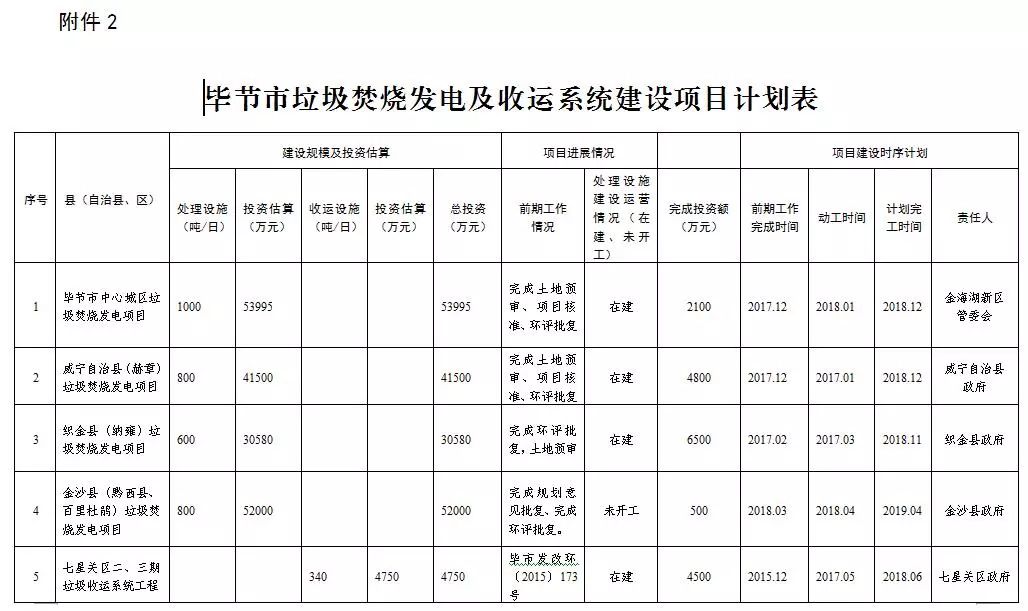 (一)項目攻堅(2018—2019年),集中解決垃圾處理設施短板。規(guī)劃建設城鄉(xiāng)垃圾收運處理設施,新增垃圾處理能力4400噸/日,新增垃圾轉(zhuǎn)運能力3500噸/日。七星關區(qū)、金沙縣85%以上行政村垃圾得到有效治理,其他縣(自治縣、區(qū))80%以上行政村垃圾得到有效治理。