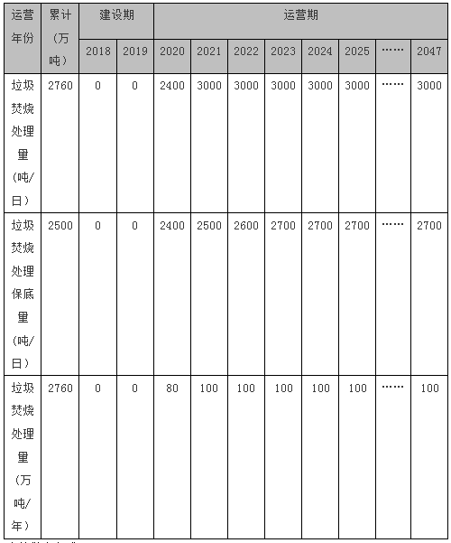 生活垃圾處理量運(yùn)營(yíng)期第一年為2400噸/日,以后年份均為3000噸/日處理量,年有效運(yùn)行時(shí)間8000小時(shí),處理量測(cè)算見下表: