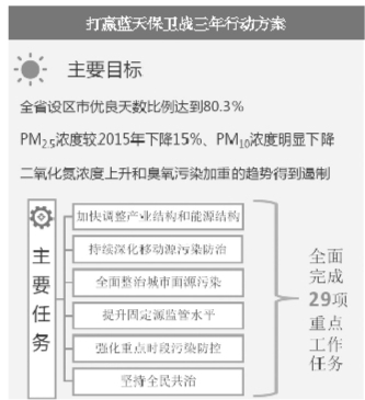 據(jù)了解,新《三年行動方案》計劃用3年時間,通過調(diào)整產(chǎn)業(yè)結(jié)構(gòu)、優(yōu)化能源結(jié)構(gòu)、完善交通運輸結(jié)構(gòu)、狠抓重污染天氣應(yīng)對等措施,全面完成29項重點工作任務(wù),讓全省的環(huán)境空氣質(zhì)量不斷改善。到2020年,全省設(shè)區(qū)市優(yōu)良天數(shù)比例達(dá)到80.3%,PM2.5濃度較2015年下降15%,PM10濃度明顯下降,重污染天數(shù)明顯減少,二氧化氮濃度上升和臭氧污染加重的趨勢得到遏制,二氧化硫、一氧化碳年均濃度基本達(dá)到國家環(huán)境空氣質(zhì)量二級標(biāo)準(zhǔn)。