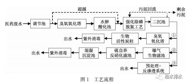 深圳國(guó)家生物醫(yī)藥產(chǎn)業(yè)園區(qū)醫(yī)藥企業(yè)排放的廢水成分主要以化學(xué)合成類(lèi)、混裝制劑類(lèi)為主,輔以中藥類(lèi)、提取類(lèi)、生物工程類(lèi)、發(fā)酵類(lèi)。該類(lèi)廢水通過(guò)城市生活污水處理廠(chǎng)無(wú)法直接處理,為了保護(hù)環(huán)境安全,促進(jìn)園區(qū)內(nèi)生物醫(yī)藥企業(yè)的發(fā)展和潛在生物醫(yī)藥企業(yè)的入駐,擬在園區(qū)內(nèi)建設(shè)統(tǒng)一的醫(yī)藥廢水處理廠(chǎng),將園區(qū)內(nèi)自行處理至接管標(biāo)準(zhǔn)的各類(lèi)廢水收集后作進(jìn)一步深度處理。對(duì)于成分復(fù)雜、可生化性差的醫(yī)藥廢水來(lái)說(shuō),仍是目前國(guó)內(nèi)外水處理的熱點(diǎn)與難點(diǎn)。目前,在醫(yī)藥廢水的處理上,國(guó)內(nèi)外研究者針對(duì)低濃度COD廢水,采用CASS、SBR、MBR、UNITANK以及氧化溝等好氧工藝處理方式進(jìn)行研究,對(duì)于高濃度COD廢水通過(guò)厭氧法進(jìn)行處理。本研究在確定工藝時(shí)采用生化處理與深度處理相結(jié)合的方式,尋求穩(wěn)定可靠的工藝流程及參數(shù),出水水質(zhì)達(dá)到《地表水環(huán)境質(zhì)量標(biāo)準(zhǔn)》(GB 3838-2002)IV類(lèi)水標(biāo)準(zhǔn)(其中TN≤5 mg/L)。