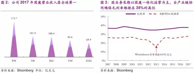 截止2018年5月23日,WM市值達(dá)357億美元。公司2017年垃圾處理量高達(dá)1.13億噸,實(shí)現(xiàn)營(yíng)業(yè)收入145億美元,EBIT和EBITDA分別為26和40億美元。公司2017年固廢營(yíng)業(yè)收入居全球第一,領(lǐng)先第二名威立雅達(dá)70%,而這一切都建立在公司僅在美國和加拿大運(yùn)營(yíng)的基礎(chǔ)上,充分展現(xiàn)出公司在固廢領(lǐng)域的絕對(duì)統(tǒng)治力。